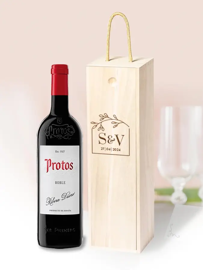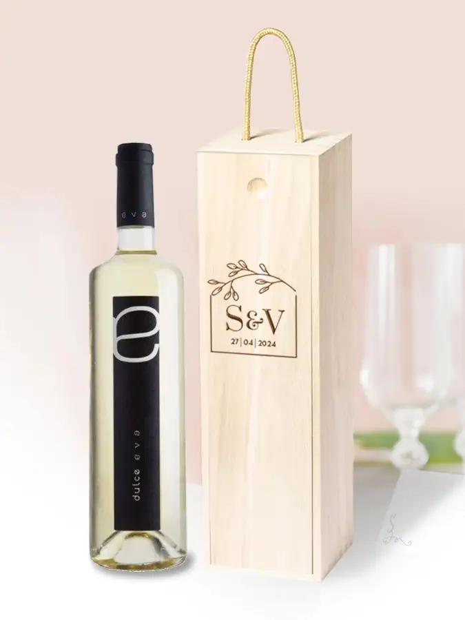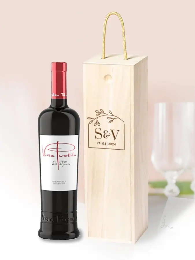 Imagina esto: una caja de madera elegante y personalizada con sus iniciales y la fecha de la boda. Suena genial, ¿verdad? pues la Caja y Botella de vino personalizada para Bodas es el regalo para novios o regalo para parejas perfecto. Ideal como regalo para novios, regalos de cumpleaños, regalos de San Valentín, o para regalar a tus invitados.