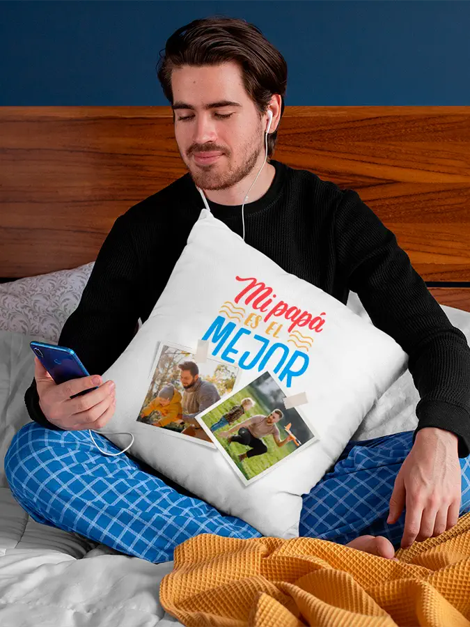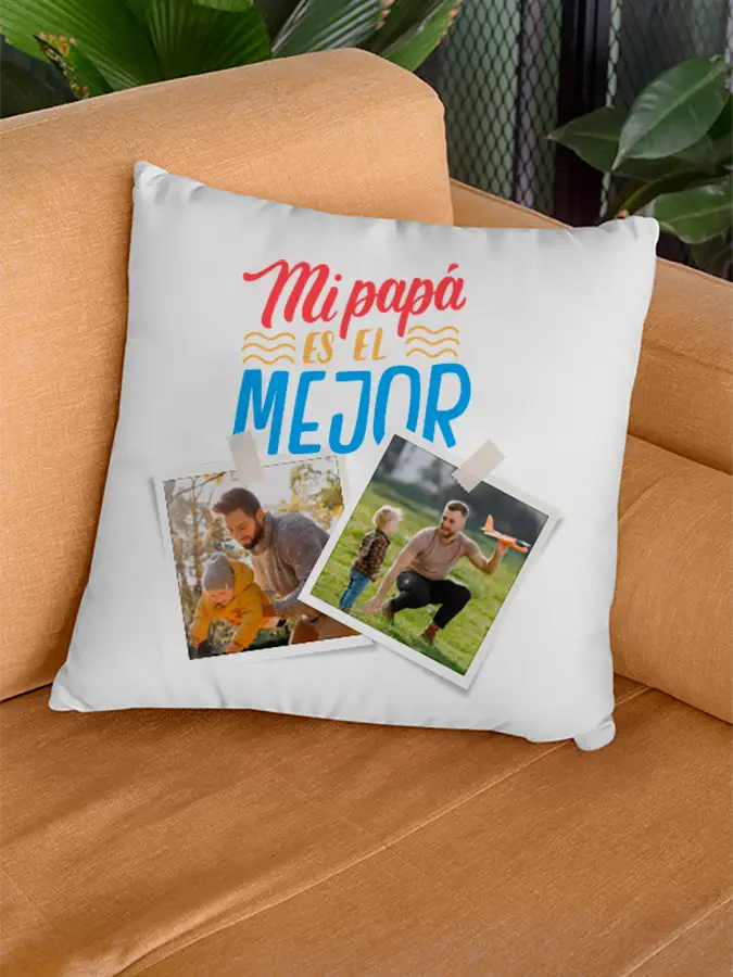 Imagina su cara de sorpresa cuando vea un cojín que no solo es cómodo, ¡sino que también está lleno de momentos memorables! Puedes elegir sus fotos favoritas, esos recuerdos que siempre lo hacen sonreír. Es un regalo original para papá que dice: «Eres el mejor papá del mundo», y que seguro conquistará su corazón. ❤️