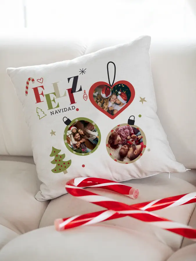 ¡Hola! 🎉 ¿Estás buscando el regalo perfecto para estas fiestas? ¡No busques más! Tenemos la solución ideal: ¡Cojín personalizado Feliz Navidad con tus fotos favoritas!