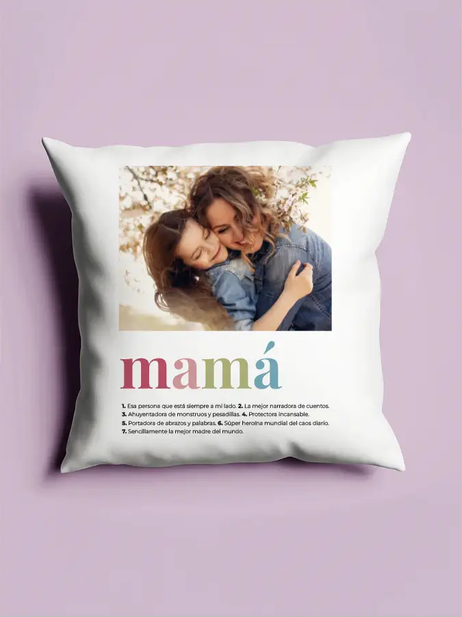 Imagina sorprender a tu mamá con un cojín personalizado MAMÁ con foto que capture esos momentos especiales. Solo tienes que elegir una foto que le encante y nosotros nos encargamos del resto. ¡Es un regalo que no solo es bonito, sino también lleno de significado! 🥰