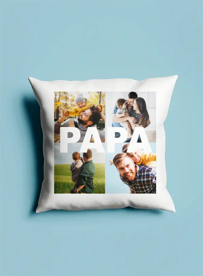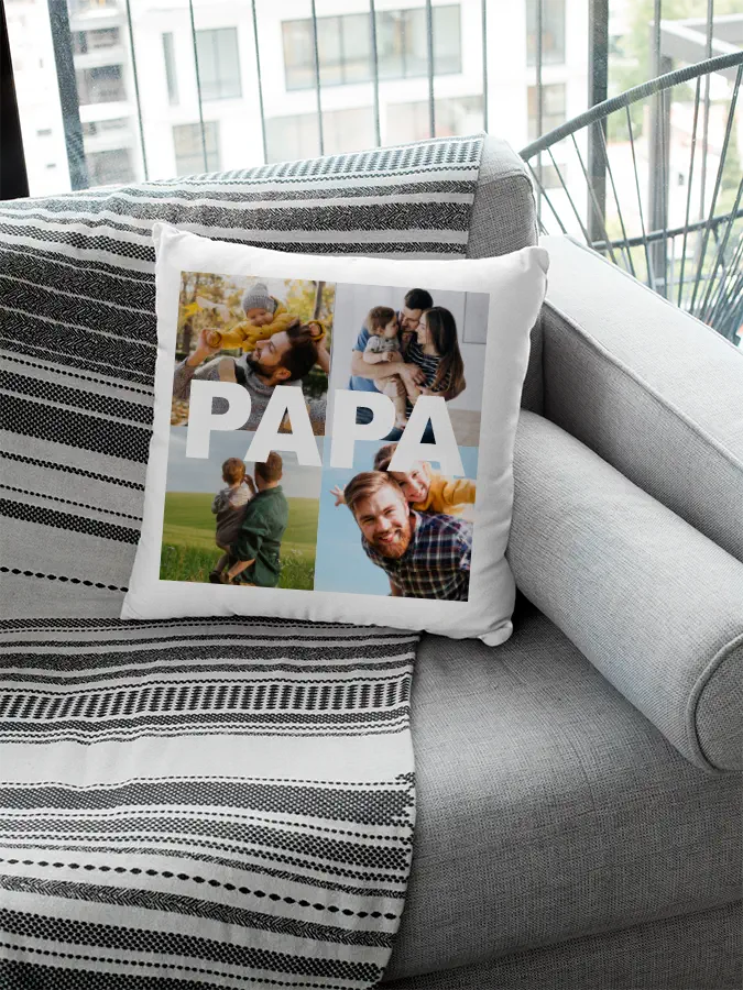 Cojín Personalizado PAPA es un regalo ideal para el Día del Padre, o simplemente porque quieres decirle a tu padre lo mucho que lo quieres. Elige las fotos mas especiales y regala un detalle único, un regalo original y personalizado que no olvidará jamás.