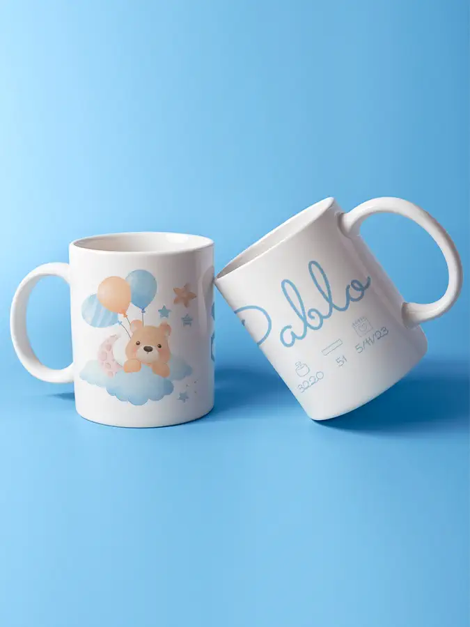 Imagina una taza con el nombre del bebé y una fecha especial, o incluso una frase divertida que haga reír a mamá cada vez que tome su café.