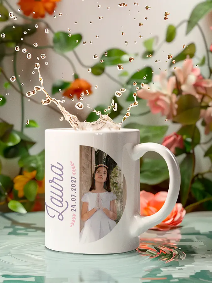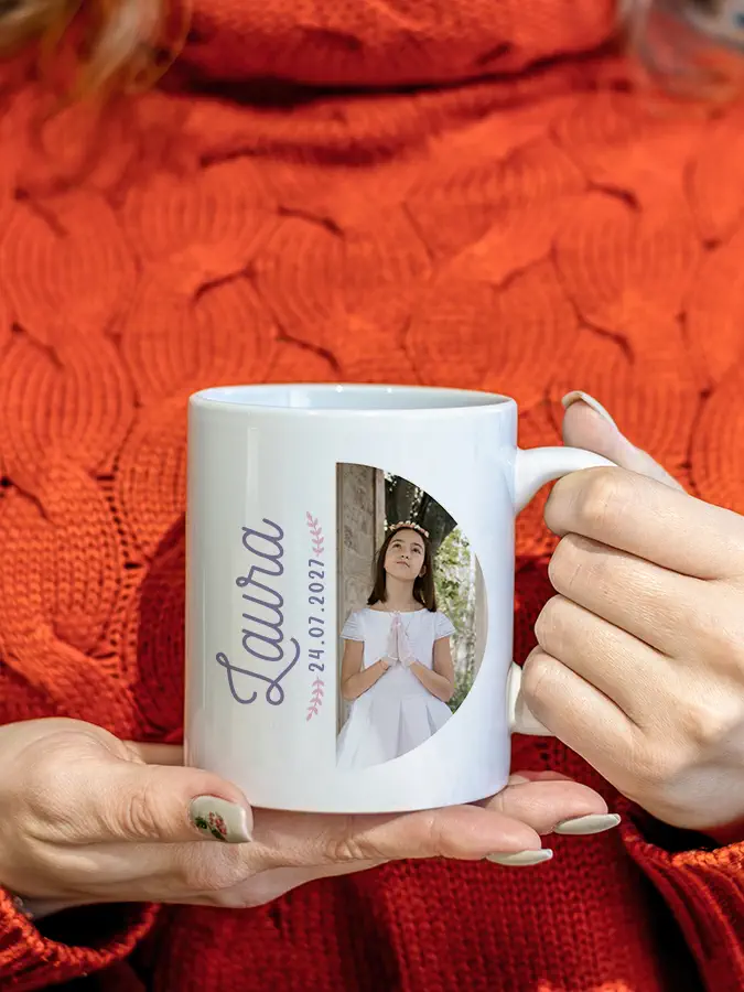 Una hermosa taza para regalar con la foto del niño o la niña que celebra su primera comunión, su nombre brillante y la fecha de este día tan especial. Es un regalo original personalizado ideal para tus invitados y familiares.